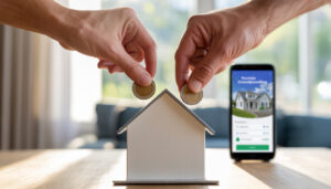 Person using a smartphone or tablet to invest in real estate, with digital icons of buildings, charts, and coins overlaying the screen.
